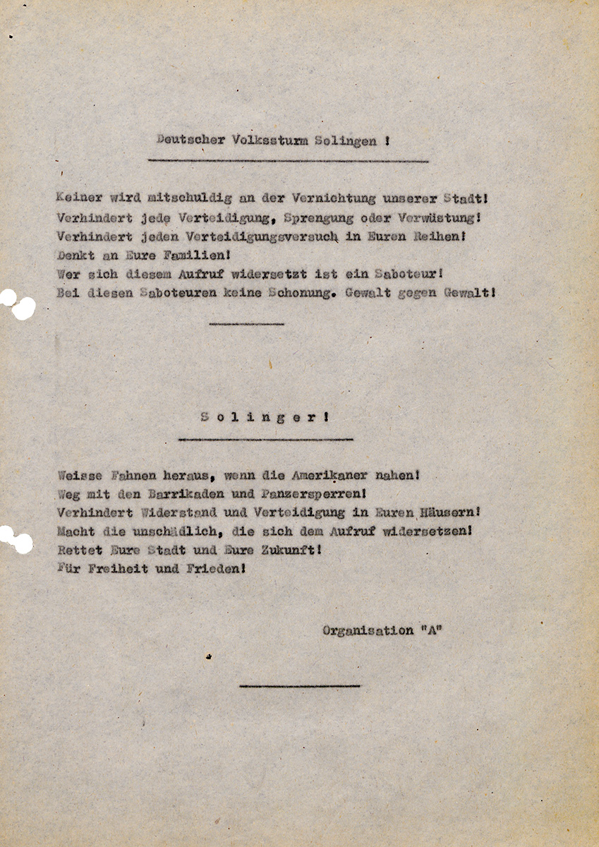 Flugblatt der „Organisation A“, Quelle: Stadtarchiv Solingen, Na 3