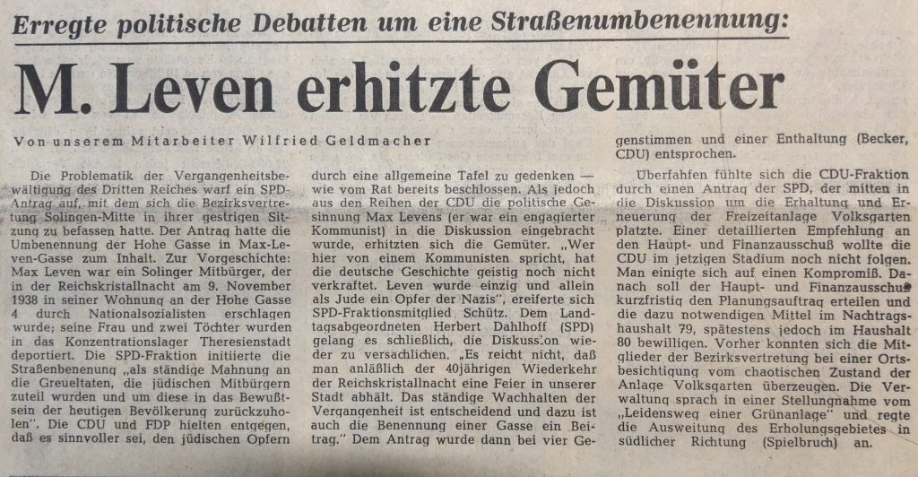 28. Februar 1979: Beschluss der Bezirksvertretung Mitte zur Umbenennung der Hohen Gasse in „Max-Leven-Gasse“ bei vier Gegenstimmen.
