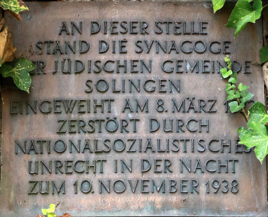 Seit 9. November 2007: Gedenkveranstaltungen zur Pogromnacht werden von der Stadt Solingen in Kooperation mit der Arbeitsgemeinschaft Christlicher Kirchen, dem Bündnis für Toleranz und Zivilcourage, der Jüdischen Kultusgemeinde Wuppertal und dem Jugendstadtrat veranstaltet.