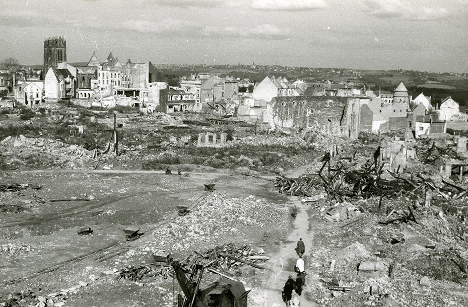 Foto der zerstörten Innenstadt 1946 von der Clemenskirche (links) bis zur Hauptstraße/Höhe Breidbacher Tor, Quelle: Stadtarchiv Solingen, RS 10532